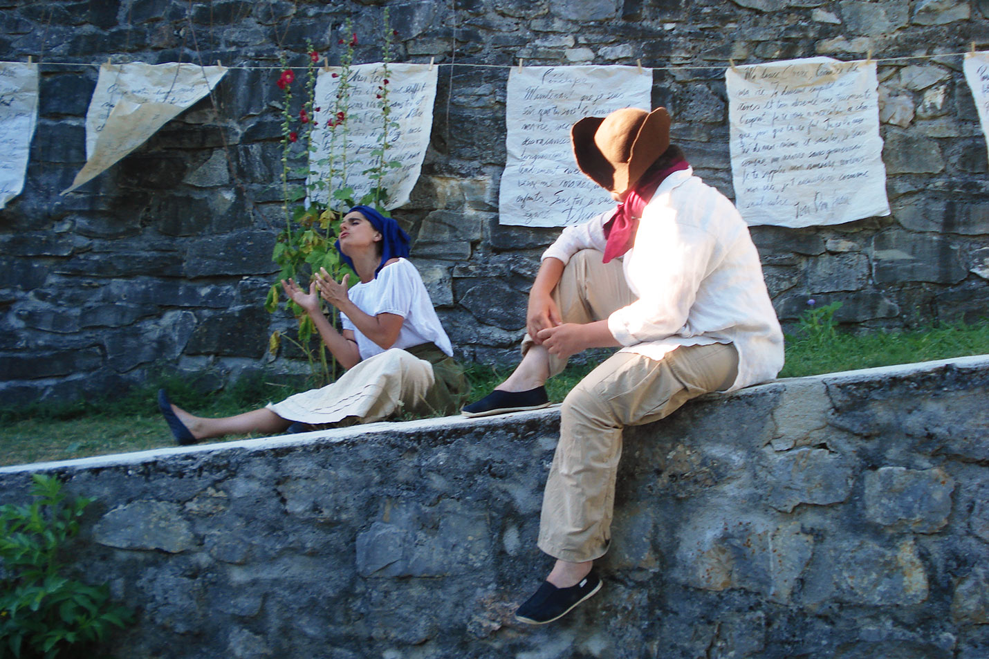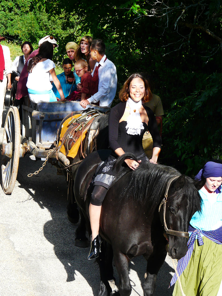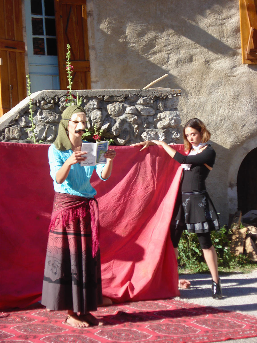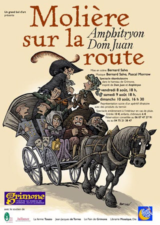 Une image du film de Mnouchkine qui sert de détonateur au projet et lancera le début du spectacle : l’arrivée des comédiens en carriole dans le hameau. Le ton est donné d’une troupe itinérante qui s’apprête à jouer des extraits de deux pièces du maître. Avec Don Juan nous explorons en théâtre déambulatoire 3 variations du rôle phare : une jeune femme, un jeune homme, un homme d’âge mûr. Amphitryon , c’est le désir d’explorer le Molière probablement le plus baroque de toute l’ œuvre. Comme pour le projet précédent c’est aussi le plaisir et le défi de voir les mêmes comédiens passer d’un registre à l’autre. A noter la scénographie de Marissa Kochanski, artiste canadienne qui tapisse le hameau de lettres géantes et participe à la construction de ces fragments d’un Molière que nous voulons imaginatif, à la fois profond et léger.